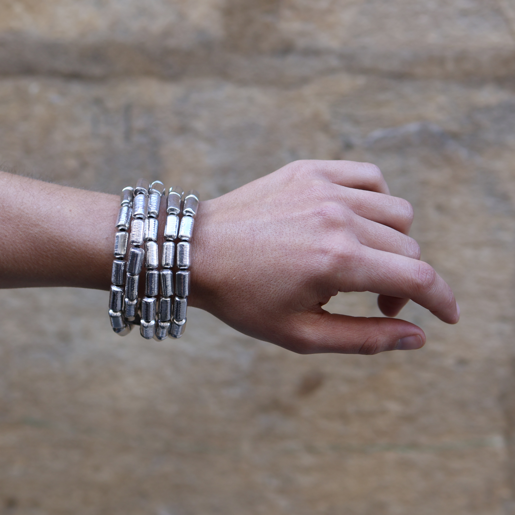 Bracelet en argent, 5x rangs, tubes martelés